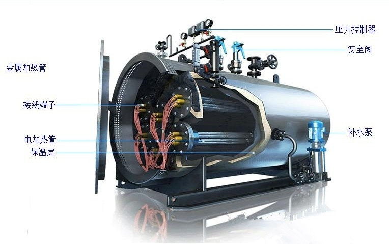 電加熱蒸汽鍋爐,主要有鍋殼筒體、鍋殼封頭及電加熱管安裝管等組成。電加熱蒸汽鍋爐結構簡單,安裝使用方便,占地面積小。全自動化操作,運行無噪音,對環境無任何污染